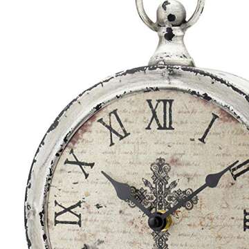 Show more Introducing the exquisite vintage-inspired Stonebriar Decorative Antique Clock, measuring a perfect 13 inches in height and 8 inches in width. This unique piece is designed to enhance any space, making it ideal for placement on a mantel, shelf, or tabletop. The clock features an elegant vintage clock face adorned with a delicate cross detail at its center, exuding a sophisticated charm that seamlessly combines functionality with artful design.