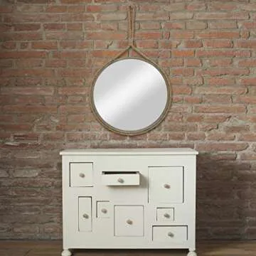 Show moreIntroducing the Stonebriar Round Decorative Mirror – a stunning fusion of coastal charm and modern design. Measuring a generous 25 inches in diameter, this decorative ocean-inspired mirror features a crystal-clear glass mirror set within a robust metal frame, all beautifully accented by a real rope trim. The incorporated rope hanging loop not only enhances its nautical aesthetic but also ensures it complements a variety of decor styles, from farmhouse to coastal chic. This versatile masterpiece is perfect for elevating the ambiance in your bathroom, bedroom, living room, or hallway, making it a must-have addition to your home.