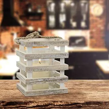 Stonebriar Small Worn White Wooden Beach House Candle Lantern with Rope Handle and Removable Glass Cylinder Hurricane
