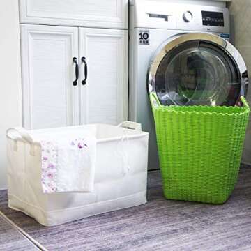 Storage basket collapsible white canvas with drawstring cover and handle, waterproof lining for storage and sorting of clothes, toys or office files