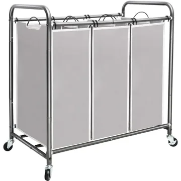Show moreTransform your laundry routine with the STORAGE MANIAC 3 Section Laundry Sorter, designed for efficiency and convenience. This innovative laundry hamper cart features three spacious, removable bags, each capable of holding up to 25 lbs of laundry, making sorting and transporting your clothes a breeze. The bags are made from eco-friendly polyester canvas with a waterproof, easy-to-wipe lining, ensuring durability and easy maintenance. With its heavy-duty metal frame and four rolling wheels, two of which are lockable, this laundry sorter offers stability and mobility, allowing you to move it effortlessly around your home. The easy installation and sturdy construction make it a must-have for any household or hotel looking to keep laundry organized and spaces tidy.