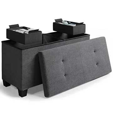 What sets this ottoman apart is its ingenious two removable storage bins that ensure all your essentials are organized and out of sight, while the main storage compartment holds bulkier items such as throw blankets and pillows, making it an incredibly practical and stylish accessory for any room. If you want an attractive, space-saving solution that provides both form and function, the Tufted Ottoman Bench is the ultimate choice.