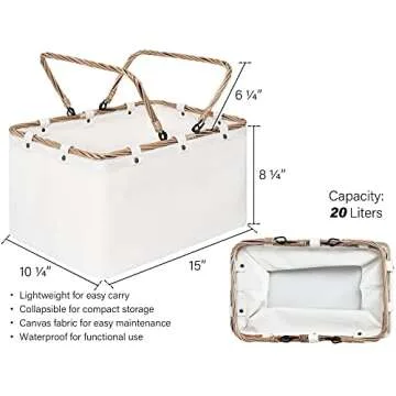 StorageWorks 20L Storage Baskets for Bathroom Organizing, Shopping Basket with Wicker Handles, Collapsible Picnic Basket, Ivory White, 15”L x 10 ¼”W x 8 ¼”H