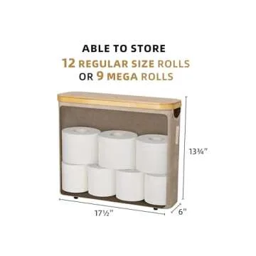 Show moreDiscover the perfect blend of functionality and style with the StorageWorks Toilet Paper Storage Basket. Measuring a generous 17.5”L x 6”W x 13.75”H, this elegantly designed basket holds up to 12 standard rolls or 9 mega rolls with ease. Constructed from premium quality bamboo and natural fibers, it not only boasts a sleek appearance but also offers a practical bathroom storage solution that complements any decor. Whether you are looking to tidy up your bathroom or simply want to prevent those awkward moments of running out of toilet paper, this organizer excels in both functionality and aesthetics.