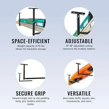 Show moreIntroducing the StoreYourBoard Adjustable Ceiling Rack – your ultimate solution for efficient and organized ladder storage! Designed for indoor spaces such as garages, sheds, and basements, this innovative ladder storage rack maximizes your overhead space while providing a sturdy, reliable storage solution for various types of ladders. Its adjustable height ranges from 12.125" to 20.125", ensuring it perfectly accommodates your specific ladder sizes and needs. Whether you own folding ladders, step ladders, telescoping ladders, or extension ladders, this ceiling-mounted rack is engineered to hold them all with ease.