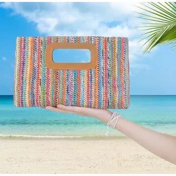 Show moreIntroducing the Straw Purse Top Handle Clutch Bag, the quintessential fashion accessory designed for the modern woman who enjoys elegance and versatility. This beautifully crafted woven beach shoulder bag marries form and function, featuring a classic shape complemented by a chic vegan leather decor handle. Its eye-catching design ensures you stand out during your summer escapades, whether you’re hitting the beach, attending a garden wedding, or enjoying a night out.