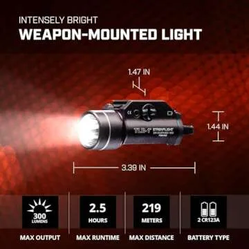 Show more Illuminate your tactical experience with the Streamlight 69110 TLR-1, a robust and reliable weapon-mounted light engineered for serious shooters. With an impressive output of 300 lumens and a peak beam intensity of 12,000 candela, this light transforms darkest environments into well-lit scenes, allowing for precise target identification. Built with advanced LED technology, it boasts a remarkable lifespan of 50,000 hours, ensuring that you're always prepared without the hassle of frequent bulb replacements.