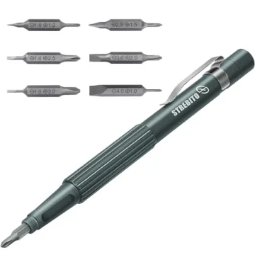 Show more Introducing the ultimate companion for all your intricate tasks— the STREBITO Multi-Bit Small Screwdriver. This precision tool features an impressive assortment of 12 precision sizes along with a 4 mm nut driver, making it perfect for a variety of applications such as thermostats, jewelry repair, or electronics maintenance. With bits ranging from Phillips (PH1.0 to PH3.0) to Flat Head (SL1.0 to SL4.0), this versatile screwdriver is designed to meet the demands of professionals and hobbyists alike.