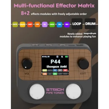 Show moreIntroducing the STRICH Pipe Tones Pocket Multi-Effects Processor, a revolutionary compact desktop-style unit designed specifically for electric guitar and bass enthusiasts. Perfect for home practice, recording, and live performances, this device eliminates the need for cumbersome pedalboards while delivering a plethora of sound-shaping capabilities. With a sleek and portable design, you can easily toss it into your bag, allowing you to jam anywhere, anytime—be it at a friend's house or a cozy café. The 2-inch color TFT display enhances usability, allowing you quick access to presets and effects with remarkable clarity. This multi-effects processor boasts 125 diverse effect types and can handle up to 10 simultaneous effect modules. Whether you're dialing in distortion, delay, or modulation effects, you'll find this unit inspires creativity and enhances your music-making journey.