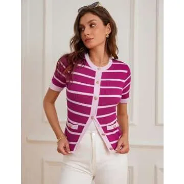 Show more The perfect blend of style and comfort, this dressy cardigan is designed to elevate your wardrobe effortlessly. Made by a reputable brand known for its high-quality fashion pieces, this cardigan features an exquisite striped design with charming gold buttons that add a touch of elegance. Short sleeves and a classy crewneck give it a modern twist, while the ribbed fabric ensures it retains its shape over time. The slim fit design accentuates your natural waistline, making you feel feminine and sophisticated.