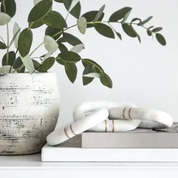 Show moreIntroducing the exquisite ‘Ela’ Marble Chain, a stunning piece of modern home decor that transforms any space into a luxurious haven. Crafted from real marble, this unique decor item is perfect for elevating the style of your coffee table, entryway table, or bookshelves. Measuring at 13 inches long, 4 inches wide, and with links that range from 0.75 to 1 inch thick, its substantial size and weight exude elegance and refine your decor.