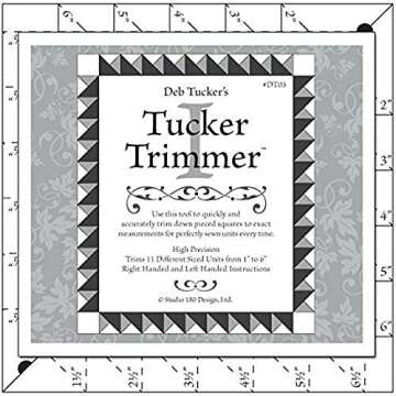 Show moreIntroducing the Studio 180 Design Tucker Trimmer I, a revolutionary quilting tool designed by the renowned Deb Tucker. This innovative trimmer not only simplifies the quilting process but also ensures precision in every cut. With its compact size of 7 inches x 7 inches, it is perfect for quilters of all skill levels, from beginners to experts. Featuring eleven versatile unit size options ranging from 1 inch to 6 inches in half-inch increments, this tool allows you to create perfect square triangles, hourglass shapes, and combination units with ease.