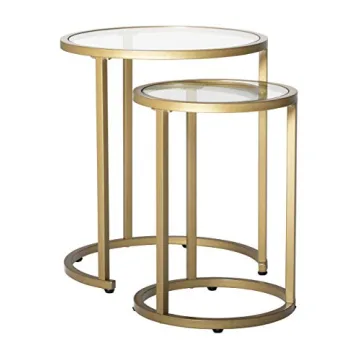 Show moreIntroduce sophistication to your living space with the Studio Designs Home Camber Modern Round Set of Nesting Tables. This stunning duo, featuring a larger table measuring 19.75" W x 19.75" D x 22.75" H and a smaller one at 14.5" W x 14.5" D x 20" H, will seamlessly integrate with your decor while offering functional elegance. The beautifully designed tables boast tempered clear glass shelves that not only enhance the aesthetic appeal but also provide durability. With a powder-coated finish in a chic matte gold tone, they resist scratches and corrosion, ensuring the tables maintain their striking appearance over time. Whether you're hosting friends or enjoying casual family game nights, these nesting tables are a perfect fit.
