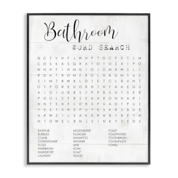 Show more Transform your bathroom into a whimsical retreat with the exquisite Stupell Industries Bathroom Word Search Giclee Art. Created by the talented artist Daphne Polselli, this captivating piece is not just art; it doubles as an engaging word search game that invites laughter and conversation, making it the perfect addition to your home. Measuring an impressive 24 x 30 inches, the vibrant colors and crisp details are achieved through the giclee printing process, ensuring that each glance at this artwork brings a smile. The sleek black frame amplifies its modern aesthetic, providing a polished finish that effortlessly elevates your bathroom decor.