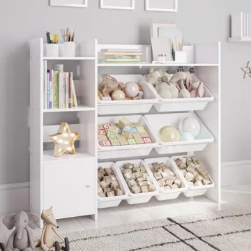 This amazing organizer comes complete with everything you need: a toy storage organizer, 4 regular-size plastic bins, 4 double-size plastic bins, and detailed assembly instructions. Not only is it practical, but it’s also a fun way to encourage children to engage in clean-up activities and keep their spaces organized.