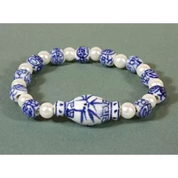 Elevate your accessory game with the stunning Style ARThouse Chinoiserie Blue and White Chinese Porcelain Stretch Bracelet. This exquisite piece features an elegant combination of blue and white glazed porcelain beads that beautifully alternate with off-white glass pearls, creating a harmonious blend of colors and textures. The craftsmanship is evident in each hand-painted ceramic bead adorned with intricate Chinese characters, adding a unique cultural charm to the overall design. As a focal...