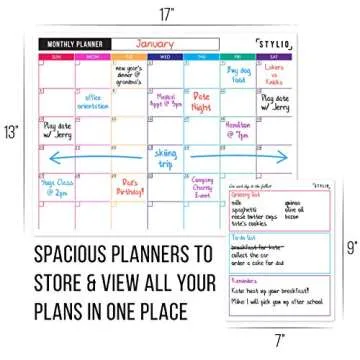 Show more Introducing the STYLIO Dry Erase Calendar Whiteboard – a revolutionary organizing solution designed for modern families, busy professionals, or anyone looking to simplify their scheduling. This innovative set includes three premium-quality magnetic boards: a monthly calendar, a weekly planner, and a to-do list notepad. Measuring 13x18" for the large boards and 5x10" for the smaller notepad, these boards are perfect for adhering to your fridge or any other metallic surface, allowing easy access for quick updates.