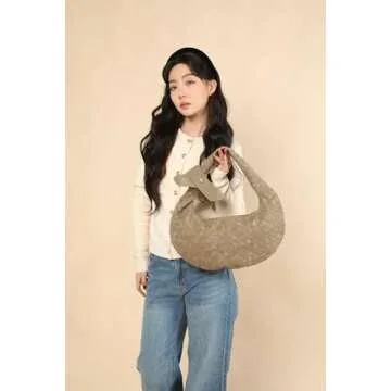 Show moreIntroducing the Suede Leather Woven Bag for Women, a stunning blend of craftsmanship and style that will elevate any outfit. Handcrafted from high-quality vegan suede, this knitted clutch exudes modern sophistication while paying homage to classic elegance. Its unique dumpling shape is accented by a delicate knotted handle and a charming removable bow tie, making it a versatile accessory that stands out. Available in two sizes, you'll find the perfect fit for any occasion, whether it's a casual outing or a formal event.
