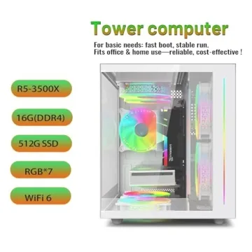 Show more The Suevery Prebuilt Gaming Desktop Computer is designed to deliver an exceptional gaming experience while catering to the needs of creative professionals and office workers alike. Powered by the AMD Ryzen 5 5600G 6-core processor, it features a base clock speed of 3.6 GHz, which can boost up to 4.1 GHz, providing plenty of processing power for multitasking and demanding applications. Coupled with 16GB of high-speed DDR4 RAM and a 512GB NVMe SSD, this desktop is engineered for lightning-fast operation and caters to various uses, from gaming to light video editing.