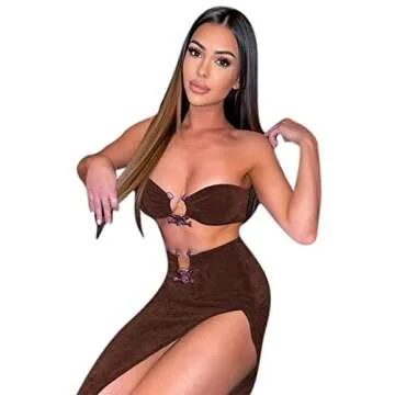 Suillty Women's Sexy 2 Piece Outfits Dress Strapless Tube Top High Waist Slit Maxi Dress Bodycon for Party Clubwear Brown