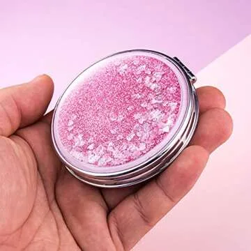 SUKPSY Compact Travel Makeup Mirror Mini Portable Double-Sided Magnifying Handheld Mirror Dream Quicksand Glitter Mirror Folding Mirror for Purses and Travel (Pink + Circular)