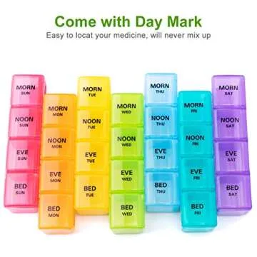 Why You Will Love This Product:Imagine the peace of mind knowing your medications are neatly organized, accessible, and protected from the elements, all in a stunning rainbow-colored design! The Sukuos Large Weekly Pill Organizer not only alleviates the stress of daily medication management but also serves as a stylish companion for your health journey. It empowers you to take charge of your health routine effortlessly, allowing you to focus on living your best life without the worry of forgotten doses or spilled pills.
