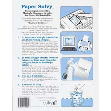 When comparing the **Sulky 409-02 Paper Solvy** with other stabilizers on the market, it becomes clear why it's the preferred choice for many fabric artists. Unlike traditional stabilizers that may leave behind unwanted residue or require excessive trimming, the Sulky brand ensures a clean dissolve when washed. Other competitors often lack the same level of quality in terms of weight—many are either too thick, affecting the drape of the fabric, or too flimsy, causing them to tear during use. With 12 sheets per package, the Sulky also offers superior value, keeping your crafting needs stocked and ready for any creative burst.