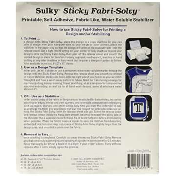 Show moreIntroducing the Sulky Sticky Fabri-Solvy Stabilizer in an impressive size of 20" x 36", designed for embroidery enthusiasts who seek precision and convenience. Made in the United States, this innovative stabilizer is a game changer in the world of needlework. Its unique adhesive properties allow you to easily position fabric without the need for pins, while its ability to dissolve in water means no messy residue is left behind. Seamlessly combine your creativity with functionality as you print, draw, or trace directly onto the stabilizer. Perfect for both beginners and seasoned embroiderers alike, it empowers you to create intricate designs with ease and clarity.