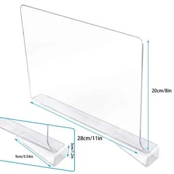 Show more Transform your closet into a model of organization with the SUMAIDA Shelf Dividers for Closet Organization. Expertly designed to maximize your storage space, these premium quality clear acrylic dividers are the ultimate solution for decluttering and enhancing the functionality of your shelves. Each divider is constructed with durable, high-quality acrylic that not only provides stability but also integrates seamlessly into your space. At 8 inches high and 12 inches deep, they are compatible with most shelves under 0.95 inches in thickness, ensuring that they fit perfectly without the risk of fracturing.