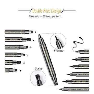 Show more Introducing the ultimate eye makeup accessory that combines creativity with functionality! This 6-piece liquid eyeliner set features a unique double-headed design, making it a must-have for anyone who loves to experiment with their eye makeup. One side of each eyeliner pencil offers a delicate soft black eyeliner for drawing precise lines, while the other side boasts a tattoo eyeliner stamp to help you unleash your imagination and adorn your eyes with fun shapes.