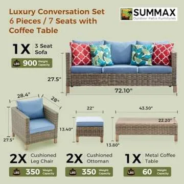 Summax 6 Pieces Sectional Sofa with Metal Top Coffee Table, Conversation Set Wicker Rattan Outdoor Furniture for Garden, Patio, Poolside, Porch PE Rattan Sofa (Blue)