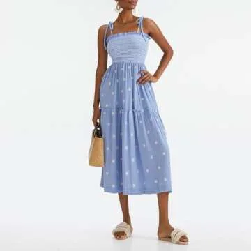Show moreStep into the sunshine and embrace the effortless elegance of our Summer Boho Maxi Dresses Sundresses for Women 2024. Loved for its exceptional blend of comfort and stylish charm, this exquisite dress is crafted from high-quality polyester and spandex. Expertly designed for maximum breathability, its swing fit and soft fabric ensure you remain cool and comfortable during hot summer days. The stunning floral embroidery adds a touch of nature-inspired beauty, and the delicate tie straps at the shoulders and smocked panel at the bust provide both support and a flattering silhouette.
