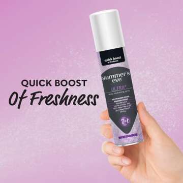 Show moreEnhance your freshness with the Summer's Eve Ultra Daily Active Feminine Spray, specifically crafted for women on the go. Whether you’re hitting the gym, heading to work, or just tackling your daily errands, this ultra-performance spray is your perfect companion. This three-pack ensures you have the confidence to refresh yourself anytime, anywhere. Enriched with an invigorating ultra scent fusing crisp aromatics and floral notes, it's gentle on the skin while effectively neutralizing odors and absorbing sweat, giving you that much-needed boost of freshness throughout your day.
