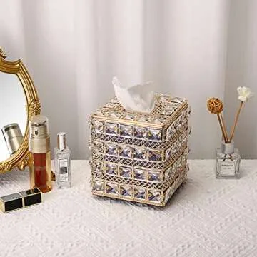Show more The perfect fusion of elegance and functionality, this stunning Crystal Tissue Box Cover is crafted from high-quality artificial crystal and stainless steel. Its gorgeous and sparkling design transforms an everyday item into a statement piece that will enhance any living space. At 6.1 x 6.1 x 6.9 inches, it boasts a larger size than traditional tissue boxes, providing ample space for tissues while maintaining an air of sophistication.