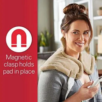 Show more The Sunbeam Heating Pad for Neck & Shoulder Pain Relief is expertly designed to deliver soothing heat therapy precisely where you need it most, providing an exceptional experience for those looking to relieve tension and discomfort. With its tailored design, this heating pad uniquely contours to your neck and shoulders, ensuring effective and targeted relief. The soft micro-plush fabric adds a layer of comfort as you unwind, making every session a refreshing escape from stress and muscle tightness.