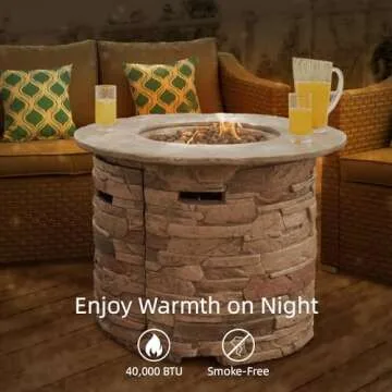 Show more Imagine transforming your outdoor space into a cozy retreat with the SUNBURY 40,000 BTU Round Propane Fire Pit. This remarkable fire pit not only provides a warm and inviting atmosphere but also elevates the aesthetic appeal of your backyard or garden. Crafted from durable concrete with a stunning stone finish, this fire pit is designed to withstand the elements while maintaining its modern charm. With a powerful propane burning feature, you can say goodbye to smoke and hello to a clean and safe flame that enhances your outdoor experience, regardless of the season.