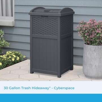 Suncast 33 Gallon Wicker-Style Hideaway Trash Can with Secure Latching Lid and Weather-Resistant Construction for Patio, Cyberspace Grey