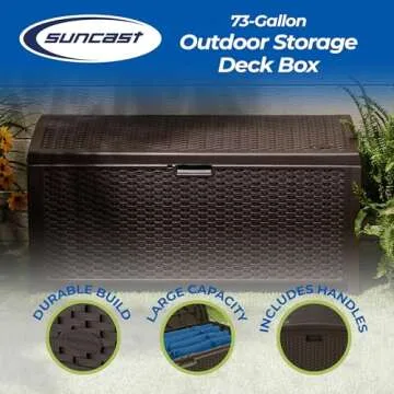 Show more Introducing the Suncast 73-Gallon Medium Deck Box, your ultimate solution for outdoor and indoor storage! Crafted from a durable, water-resistant poly resin, this stunning mocha brown storage box is an excellent addition to your patio, deck, garage, or shed. With an impressive 73-gallon capacity, it’s designed to accommodate various items effortlessly, whether you're storing pool toys, patio cushions, gardening tools, or sports equipment to keep your space organized and clutter-free.