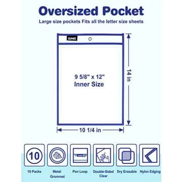 SUNEE 6 Packs Oversized Reusable Dry Erase Pocket Sleeves with Binder Ring, 6 Assorted Colors 10x14 Ticket Holders, Clear Plastic Sheet Protectors, Teacher School Classroom Supplies