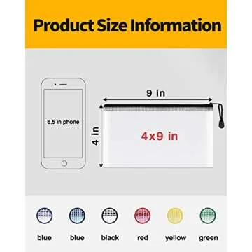 The SUNEE Mesh Zipper Pouches are 4x9 inches, suitable for various smaller items like documents and stationery.