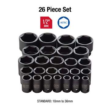 Show moreDiscover the unparalleled strength and versatility of the Sunex 2645, 1/2 Inch Drive Impact Socket Set. This premium 26-piece metric socket set, ranging from 10mm to 36mm, is crafted from high-quality Cr-Mo alloy steel, ensuring that each socket maintains exceptional durability even under high torque conditions. The innovative radius corner design reduces wear and increases torque on your fasteners, transferring force efficiently to the bolt walls rather than the corners. This functionality not only prolongs the lifespan of the sockets but also makes your tasks easier and more effective.