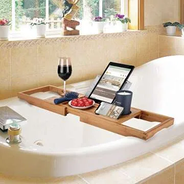 Show moreTransform your bathing experience into a sanctuary of relaxation with the SUNFICON Bathtub Caddy Tray. Designed to fit all tubs with effortless adjustments, this caddy features easy-gliding side arms that extend from 29.5’’ to 44.3’’, providing unparalleled versatility. The sleek and elegant natural bamboo construction not only adds a touch of sophistication to your bathroom décor but also ensures durability and eco-friendliness. With specialized compartments to hold your smartphone, tablet, or other essentials securely, you can indulge in your favorite media without the worry of water splashes or drops into the tub.