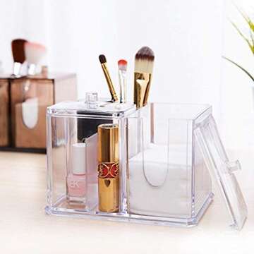 Show more The SUNFICON Q-Tip Holder is an exceptional solution for those who seek maximum organization in their daily routines. Measuring 5.28 x 3.94 x 4.53 inches, this compact yet spacious holder can accommodate over 100 cotton pads and 60 swabs, along with other small makeup essentials like cotton balls and lipsticks. With its multi-functional design, this holder is not only perfect for your beauty essentials but can also serve as a clever desk organizer for office supplies such as keys, paper clips, and staples. It's time to declutter your spaces and bring order to chaos!