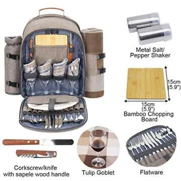 This versatile backpack features premium picnic accessories organized in a neat manner, including dishwasher-safe stainless steel flatware, hard melamine plates, and elegant wine glasses. It even includes a cheese knife, wine opener, and a metal salt/pepper shaker for all your culinary needs. You and your loved ones will be in awe as you unveil everything upon opening this remarkable picnic basket!