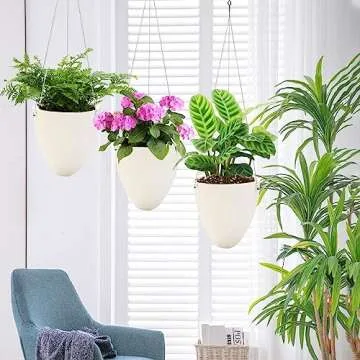 Show more Introducing the Sungmor Unique Eggshell Self Watering Hanging Planters, a revolutionary solution for plant lovers seeking combination of style and practicality. This innovative 3-piece set features a modern, simplistic design in a chic white finish, perfectly suited for both indoor and outdoor spaces. Each planter showcases a unique eggshell shape that not only enhances your decor but also supports the well-being of your plants with its self-watering functionality. The inner pot is ingeniously covered with cotton rope that absorbs and distributes water to keep the soil moist, allowing you to reduce your watering schedule significantly.