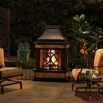 Sunjoy Outdoor Fireplace, Heirloom Patio Wood Burning Steel Fireplace with Chimney, Spark Screen, Fire Poker, and Removable Grate, Black