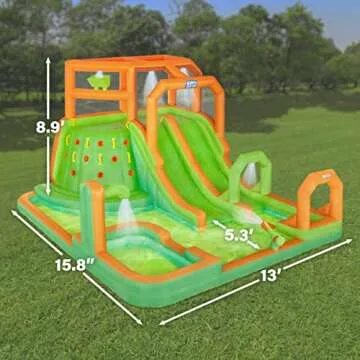 Show more Get ready for endless summer fun with the Mega Climb N’ Go Inflatable Water Slide Park! Spanning an impressive size of 15.9 x 13.1 x 8.9 feet, this inflatable water playground is expertly crafted to bring the excitement of water slides straight to your backyard. Perfectly designed by a renowned brand known for creating quality inflatable products, this water slide park features an exhilarating climbing wall, two thrilling water slides, and a spacious splashdown pool to keep children engaged for hours. Not only does it promise a refreshing escape from the summer heat, but it also offers a safe environment for kids to bounce and play under parental supervision.
