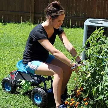 Sunnydaze Rolling Gardening Cart with Adjustable 360-Degree Swivel Seat - Utility Tool Tray and Storage Basket - Blue