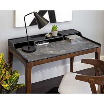 While many office desks on the market promise style or durability, the Sunpan Office Desk stands out due to its combination of premium materials and sleek modern design. Unlike standard options made from cheaper materials, this desk's construction from solid walnut and rubber wood guarantees both aesthetic appeal and longevity. Many competitors may offer similar pricing but lack the level of craftsmanship observable in every detail of this desk. The warranty further sets this piece apart, ensuring customer satisfaction and peace of mind.