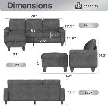 Sunrise Coast Living Room L Shaped 78" Modular Storage Ottoman 3 Seater Sofas Modern Small Sectional Couch with Dark Grey Linen Fabric, Snowflake
